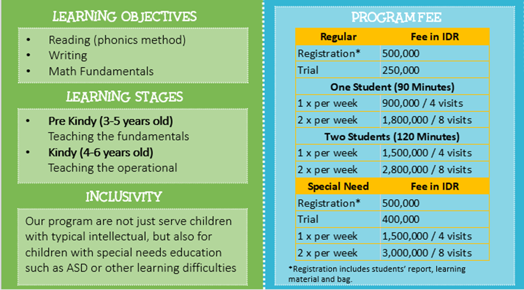 Masakecil Preschool understands that no child are born the same. They have different learning style, characters and educational needs. Our faculty are a group of educator who are always eager to help every child, best fit to their personal characteristic. For this reason, Masakecil Preschool also offer the following program